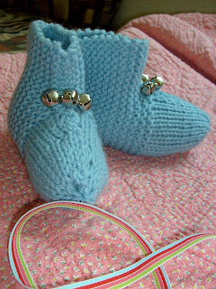 And I finished booties I started at the end of June while in Seattle, from Knitpicks Swish. These are for my grand-nephew, Brian, who was born in January, so will need somewhat larger booties when it gets cool again and he's, oh, nine months old. Hope the little jingle bells don't drive his parents batty.